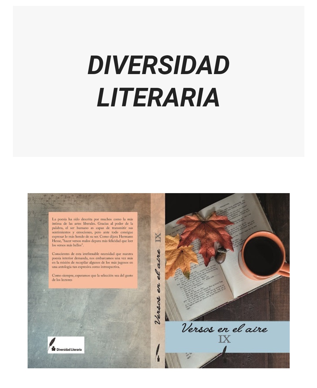 Me presenté al concurso de Diversidad literaria ya mencionado en el título de esta intervención.En este se ofrecía la oportunidad de formar parte de un libro de poesía llamado "Versos en el aire".Hace un par de días me ha llegado un correo donde me han dicho que he sido seleccionada para formar parte de este proyecto que todavía está en proceso de maquetación, el cuál estará disponible el 19 de noviembre.Se podrá obtener mediante la compra por internet en este enlace: