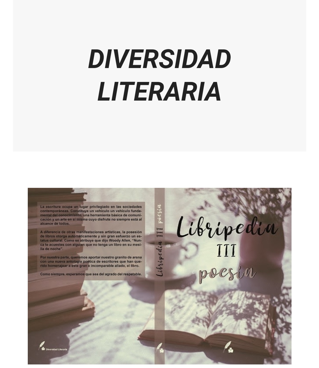 Me presenté al concurso de Diversidad literaria ya mencionado en el título de esta intervención.En este se ofrecía la oportunidad de formar parte de un libro de poesía llamado "Libripedia III Poesía".Hace un par de días me ha llegado un correo donde me han dicho que he sido seleccionada para formar parte de este proyecto que todavía está en proceso de maquetación, el cuál estará disponible el 19 de FEBRERO.Se podrá obtener mediante la compra por internet en este enlace: https://bit.ly/37eUVvJ