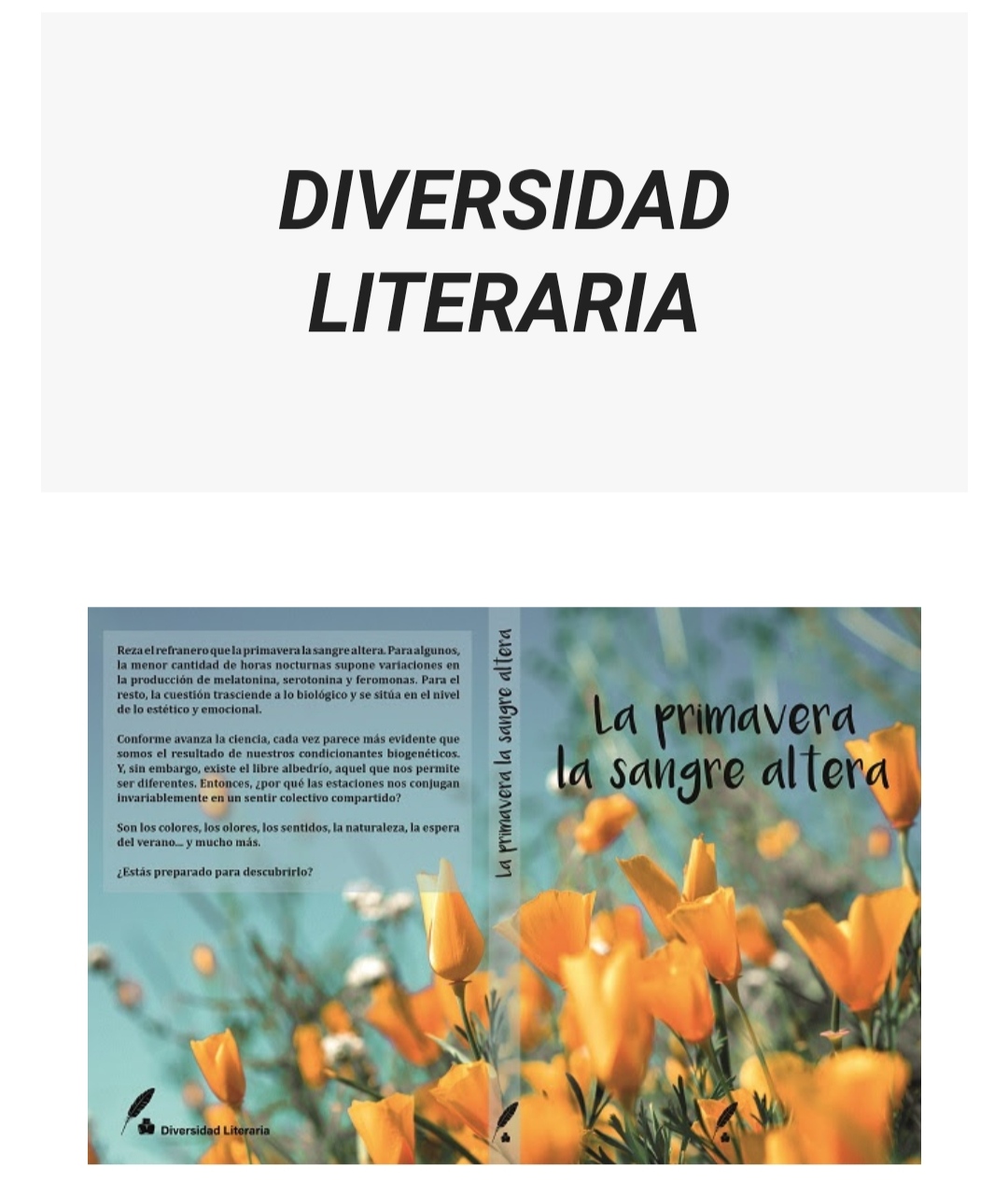 Me presenté al concurso de Diversidad literaria ya mencionado en el título de esta intervención.En este se ofrecía la oportunidad de formar parte de un libro de poesía llamado "La primavera con sangre entra".Hace un par de días me ha llegado un correo donde me han dicho que he sido seleccionada para formar parte de este proyecto que todavía está en proceso de maquetación, el cuál estará disponible el 11 de JUNIO.Se podrá obtener mediante la compra por internet en este enlace:https://bit.ly/2VxWpfo